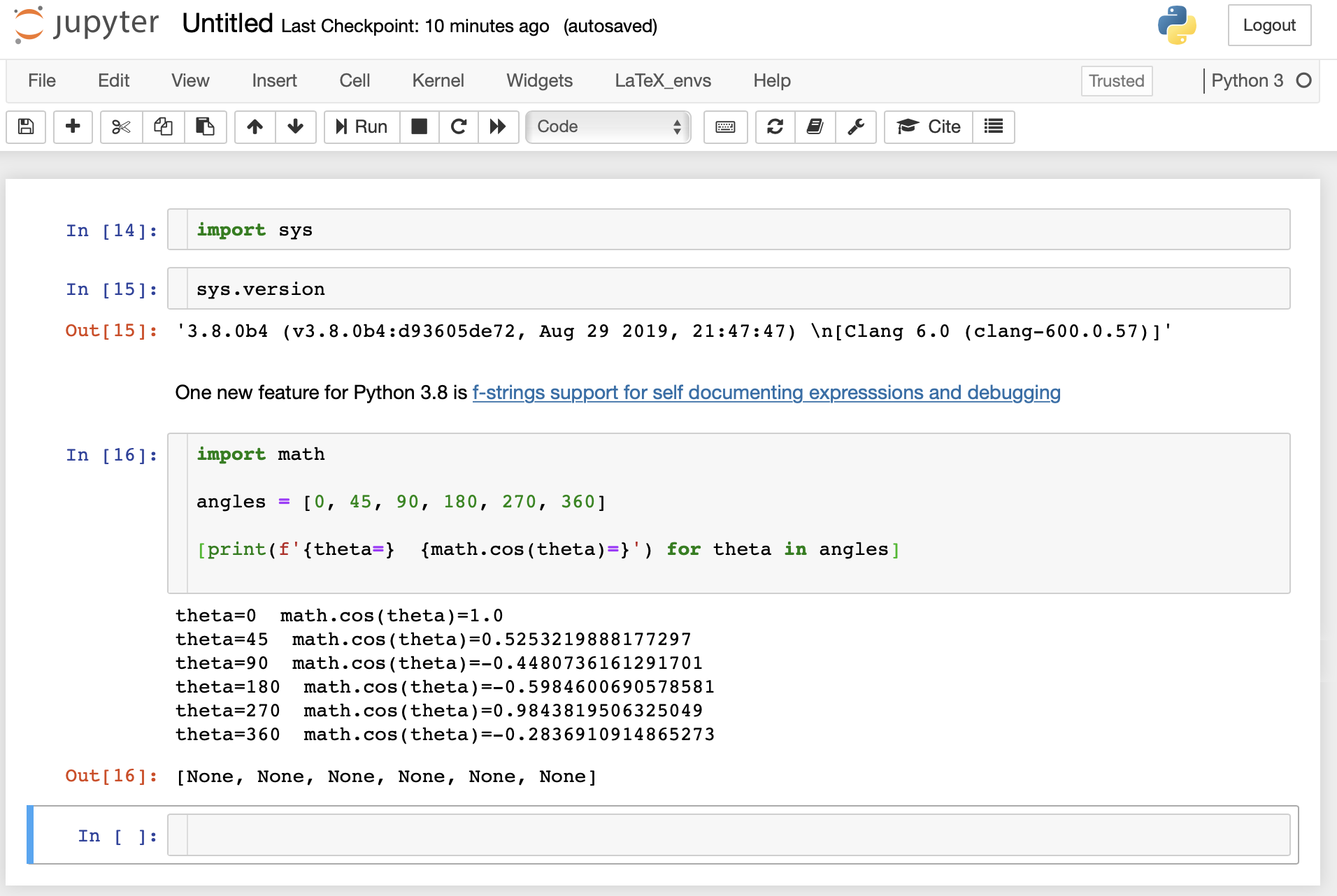 You can now begin exploring the new features in Python 3.8. This example shows f-strings support for self-documenting expressions and debugging.