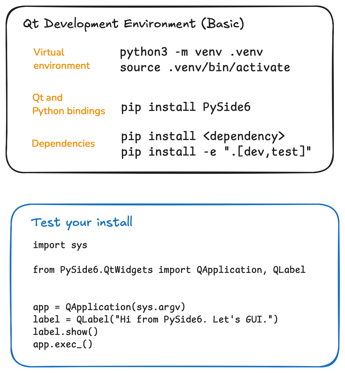 Setting up a basic test of Qt and Python bindings is a good way to ensure that your development environment is working correctly. Here’s an example to get you started.